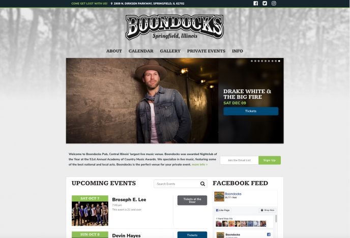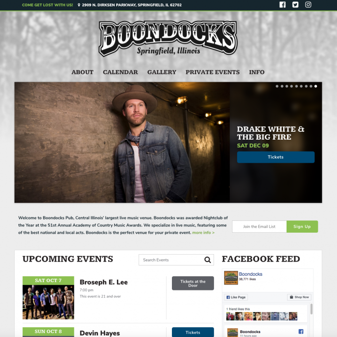 Custom website for Illinois music venue and Ticketfly client, Boondocks Pub. The site features integration with ticketfly’s event/ticketing platform. Content is easily managed thru a customized wordpress admin dashboard.