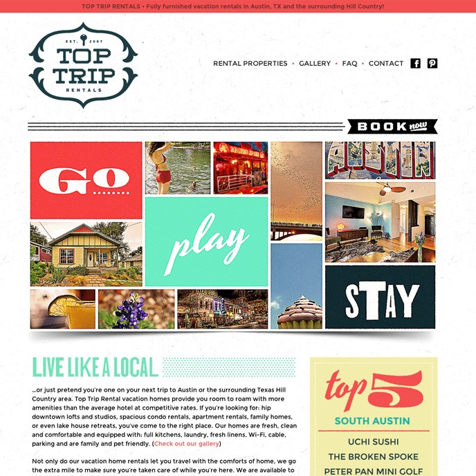 AIRSHP designed and developed a custom theme that turns the Tumblr platform into a viable CMS! Featured content areas on the homepage are populated by posts with a specific tag, the photo gallery pulls together photos from previous posts, and its all done with a custom look and feel that sets Top Trip apart from its competition – take a look if your are interested in booking a rental property while in Austin.