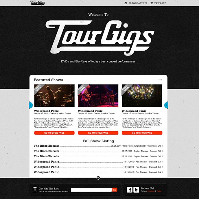Full custom web design for Austin-based TourGigs. Band pages are based on a custom designed template system – allowing for easy addition of new artist pages.